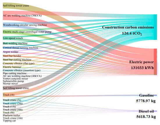 As shown in Figure 6, the total carbon emissions from the construction phase were 126.4 tCO2 and 8.06 kgCO2/m2 per unit area. The three pieces of mechanical equipment with the largest share were the self-lifting tower crane, the AC arc welding machine (30 kVA), and the truck (4 t), accounting for 16.4%, 15%, and 13.4%, respectively. In addition, electricity, gasoline, and diesel were the main sources of carbon emissions during the construction phase, and the project consumed a cumulative total of 131,033 kWh of electricity, 5778.97 kg of gasoline, and 5618.73 kg of diesel during construction. Electricity generated 92.05 tCO2 of the carbon emissions, accounting for 73% of the total. Gasoline and diesel produced 16.93 tCO2 and 17.42 tCO2, respectively.