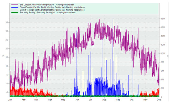 The simulation results are shown in Figure 7. The energy intensity of the hospital is 270.52 kWh/m2, of which 66.96 kWh/m2 is for cooling, 90.12 kWh/m2 is for heating, 30.22 kWh/m2 is for lighting, and 83.22 kWh/m2 is for other equipment. The total carbon emissions due to energy consumption are 148,715.32 tCO2, and the carbon emissions per unit area are 9485 kgCO2/m2. Among them, the carbon emission intensity of heating is 3154.2 kgCO2/m2, accounting for 33.25%; the carbon emission intensity of cooling is 2343.6 kgCO2/m2, accounting for 24.71%; the carbon emission intensity of lighting is 1057.7 kgCO2/m2, accounting for 11.15%; and the carbon emission intensity of other equipment is 2912.7 kgCO2/m2, accounting for 30.71%. The carbon emission intensity of other equipment is 2912.7 kgCO2/m2, accounting for 30.71%; the carbon emission intensity of domestic water is 16.8 kgCO2/m2, accounting for 0.18%.