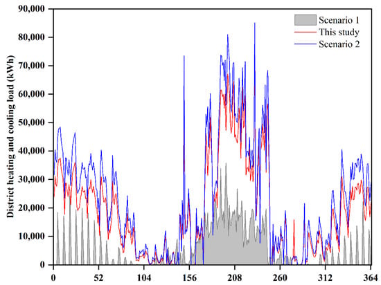 As shown in Figure 9, this section discusses the carbon emissions of inpatient buildings under different modes of operation. Scenario 1 is a standard operational mode of a hospital, in which the air changes in each of the three zones are set according to the relevant standards [63]. In this study, the “normal times” operational mode was adopted. Scenario 2 is the “emergency times” operational mode, and the number of air changes in each of the three zones is set according to the requirements issued by the Chinese government during the COVID-19 pandemic [40], as shown in Table 10. The results show that the operational carbon intensity and share in Scenario 1 are basically the same as those of the outpatient building in C20, which are 5725.89 kgCO2/m2 and 5748.39 kgCO2/m2, respectively, further verifying the reliability of the calculations. The operational energy consumption in this study is 1.8 times higher than in Scenario 1, and the carbon emissions are 1.74 times higher. The operational energy consumption in Scenario 2 is 2.08 times higher than in Scenario 1, and the carbon emissions are 2.72 times higher.