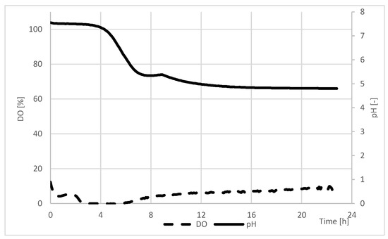 Based on the course of changes in the amount of dissolved oxygen and the pH value of the reaction mixture, four phases of the process can be observed. The first one, which can be described as adaptation, was when the bacteria adapted their enzymatic apparatus to the components of the new medium. During this time, the saturation of MTE extract with dissolved oxygen remained at approximately 5%, and the pH of the reaction mixture remained at approximately 7.4. In the next phase, intensive fermentation, the bacteria consumed the sugar component of the medium. They produced lactic acid, as evidenced by a rapid drop in the pH of the reaction mixture (from 7.4 to 5.4). In the next stage, the pH of the reaction mixture remained constant (approximately 5.35), and the saturation of the fermentation medium with dissolved oxygen slowly began to increase. It was in this stage when the bacteria began preparing to use other medium components. The last, and longest, stage of the process was characterized by slow changes in the pH of the mixture and a gradual increase in the amount of dissolved oxygen. At this stage, the microorganisms probably metabolized some amino acids.