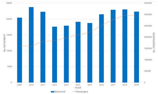 The airport is located entirely in the municipality of Olbia, a few kilometers from the town center, in the northeastern area of Sardinia. The airport is located within an area of significant tourist, cultural, and commercial interest; therefore, it is important to ensure the reliability of air traffic in northern Sardinia. Thus, Costa Smeralda Airport is a highly seasonal airport, with constantly increasing traffic [23], as shown in Figure 4.