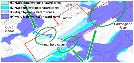 Figure 5. Critical areas subject to flooding (highlighted with green arrows and marks) and zoning, representing hydraulic hazards.