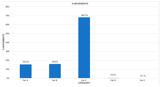 This number is identified in relation to the type of aircraft and the number of aircraft that engage at the airport during rush hour. So, it was necessary to analyze the fleet mix of aircraft landing in Costa Smeralda Airport. Indeed, the lighter the aircraft, the easier it is to exit from the intermediate exits (RETs) along the runway. Conversely, heavier aircraft require more space for landing, braking, and exiting the runway. Data provided by the airport management company revealed that the most frequent type of aircraft belong to category C of the ICAO classification (see Figure 8).