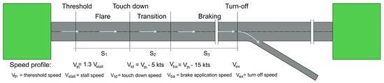 These estimations are generally made according to the different needs of each airport. To define the location of the RET, after first identifying the operating conditions of the airport, we established a representative fleet mix for the scenario in which the exit is intended to serve and verified that the distance between the runway and the taxiway was sufficient to allow the introduction of this new infrastructure. The three-segment method was used, which consists of the sum of three segments, shown in Figure 9, which depend on different factors, such as the aircraft category, the slope of the touchdown zone, wind conditions, the threshold crossing speed, and the speed turn-off and deceleration rates, and can be analytically quantified using the equations in Table 1.