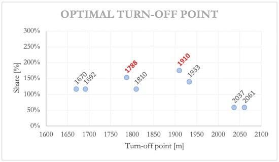 Subsequently, to consider the dispersion occurring at the touchdown point, in the transition interval, and in the braking distance, the Optimal Turning Segment (OTS) was evaluated by summing 100 m before and 200 m after the OTPs calculated. The optimal locations of RETs were determined in relation to the OTP and OTS parameters: the OTS with the highest percentage of aircraft served was selected, and the percentage of aircraft for which the OTP is a part within the OTS was then added. The OTPs that have a non-negligible percentage were at 1788 m and 1910 m, and they are highlighted in Figure 10.