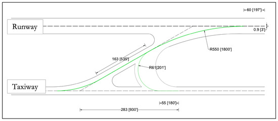 To pursue the safety objective of RETs and consequently facilitate the rapid and safe exit of the aircraft from the runway [53], it is necessary to carefully design this infrastructure in such a way that it is optimally positioned along the runway. The ICAO [21] and FAA [22] define RETs as traffic routes connected to the runway via an acute angle, generally equal to 30°, which can accommodate aircraft at speeds of approximately 45/50 knots. Standardizing the design of these connections is essential for facilitating easier and safer landing maneuvers by pilots at any airport in the world. The two methodologies for designing RETs, proposed by ICAO [20,21] and the FAA [22], are described below.