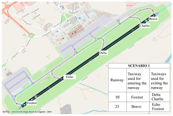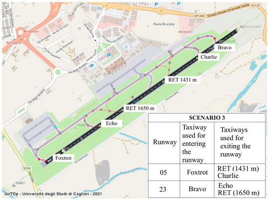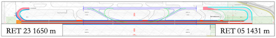 We performed a series of simulations for each of the two different runways, 05 and 23, and for two fleet mixes: one comprising all aircraft in the airport, including those with low employment rates, and one that contained only aircraft with a high percentage of occupation. The simulation results show that the position of the RET along the runway does not change when varying the two fleet mixes; this is because the new releases include more category C aircraft, which are present at the airport for longer times, while other types of aircraft could use the new exits or continue to use the existing exits. However, there is an obvious difference in the location of the new infrastructure identified for the two runways (see Table 3 and Figure 13).