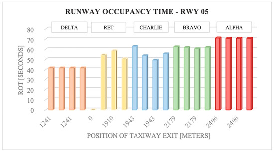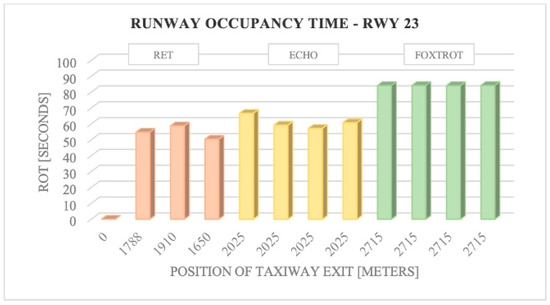 Once the ROT values were determined, the runway capacity was evaluated according to the configuration of the current exits and various configurations of RETs based on the new designs. The findings indicate that the best scenario for maximizing capacity results from combining the ICAO and FAA guidelines. For RWY 05, the highest improvement of 6 mov/h is achieved by placing the RET at 1788 m from the threshold, which is the distance obtained through the ICAO regulations. For RWY 23, the highest capacity increment of 8 mov/h is obtained by placing the RET at 1650 m from the threshold, which is the distance obtained through REDIM software (FAA).