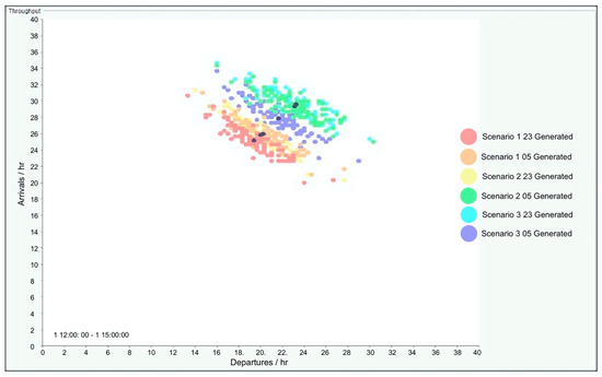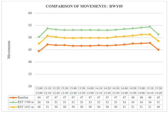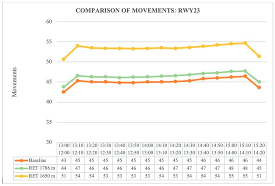For RWY 05, as shown in Figure 19, the observed capacity increase is 6 mov/h with the RET positioned at 1788 m and 3 mov/h when the RET is positioned at 1431 m. For RWY 23, as shown in Figure 20, an improvement in capacity of 1 mov/h was obtained for the RET positioned at 1788 m and 8 mov/h for the RET positioned at 1650 m.
