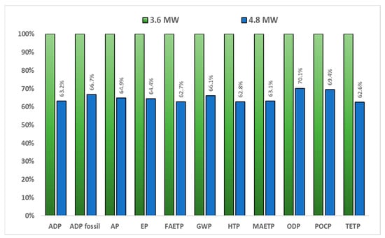 The life cycle environmental impacts of one kWh of electricity produced by 3.6 MW and 4.8 MW onshore wind turbines operating in Turkey are compared in Figure 5. As expected, the unwanted environmental impacts are reduced by around 63, 67, 65, 64, 63, 66, 63, 63, 70, 69, and 63% for ADP, ADP fossil, AP, EP, FAETP, GWP, HTP, MAETP, ODP, POCP, and TETP, namely when 4.8 MW onshore wind turbines are used instead of 3.6 MW ones.