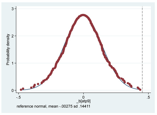 Lastly, we constructed a randomly assigned value of ATPs (Random_ATP9) variable to conduct our placebo tests. If true ATPs indeed affect CSR disclosure, then the randomly assigned ATPs should not show a similar effect. We repeated this random assignment 1000 times and plotted the distribution of the estimated coefficients of Random_ATP9. As shown in Figure 1, the estimated coefficients of Random_ATP9 are normally distributed around 0, excluding the influence of unobservable firm heterogeneity on our results.