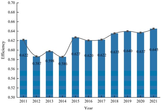 Using Dearun software V3.2.0.2, combined with the super-efficient SBM model, the total factor flow efficiency of urban and rural areas in China’s 27 provinces and autonomous regions is measured from the perspective of variable returns to scale over the period 2011–2021. The specific results are shown in Table 2, while Figure 1 demonstrates the trend of China’s urban–rural total factor flow efficiency during the examination period.