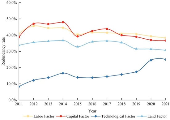 Variation trend of total factor input redundancy in urban and rural areas from 2011 to 2021.