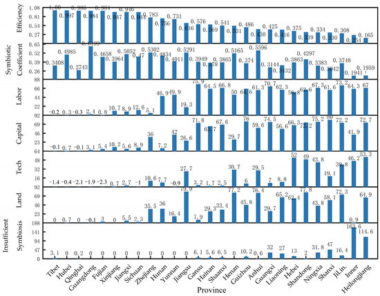 The comprehensive analysis of efficiency, input redundancy, output deficiency, and urban–rural symbiosis level was conducted to unveil the systematic factors contributing to the insufficient total factor flow efficiency in urban and rural areas. The results are illustrated in Figure 3.