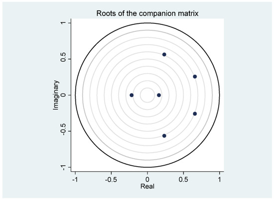 In fact, as it is possible to deduce from Figure 1, all the roots are located inside the unit circle, thus confirming both the stability of the PVAR model and the stability of the estimated model [76].