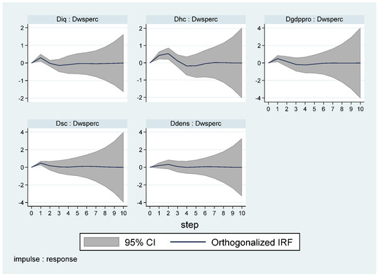In addition to the effects of our regressors on the trend of Italian regions towards recycling—for which the empirical evidence shows the magnitude of the effects (Table 10)—with the aim of supporting discussions and desirable policies, we provide graphs that display the trend of the impulse (Figure 2), i.e., how the dependent variable responds to changes in each independent variable over the years.