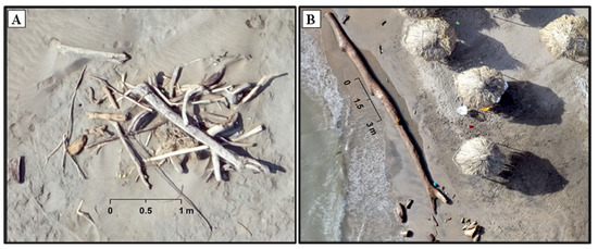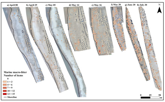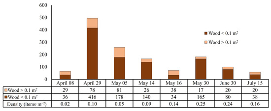The aerophotogrammetric surveys using drones varied in the coverage area of the flights, ranging from 2490 m2 (May 14) to 5392 m2 (June 30). The visual screening of the 8 orthomosaic images showed a total of 2113 waste items, resulting in a density of between 0.004 and 0.25 items·m−2 (Table 1). Concurrently, there was a total of 1396 items of large wood debris (LWD) on the beach, resulting in a density of between 0.02 and 0.251 items·m−2 (Figure 2).