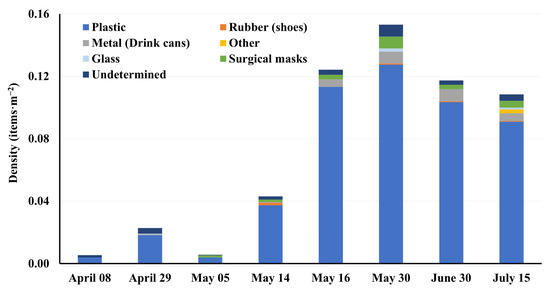 Density (items·m−2) and types of marine macro-litter found per sampling day. Note the sharp increase in density of all items, but especially plastics, on the reopening date, May 16th, and subsequently.