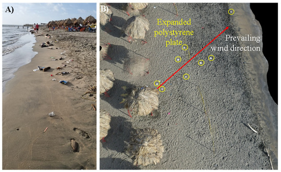 The variability in coastal marine litter accumulation also has a direct relationship with the degree and characteristics of ocean transport [65]. This sector of the Colombian Caribbean coast is strongly influenced by longshore currents, which transport part of the waste that reaches the ocean through the Magdalena River [34]. Another important parameter in the marine macro-litter distribution on this beach is the predominant wind direction, which can be considered the main factor in the litter distribution along the entire beach strip. With the predominant offshore wind direction and the intensive use of the backshore, the waste remaining on the beach is transported across and along the beach to the wave swash line (Figure 7). Thus, tourist-derived marine litter is added to the marine litter transported by the currents. On most beaches, onshore winds are predominant, and marine litter tends to accumulate in the dune system or back-beach vegetation [9,12,36]. Thus, as identified in the waste dispersion model developed by Critchell et al. [65], the physical characteristics of the source location have the greatest effect on the destination of the litter.