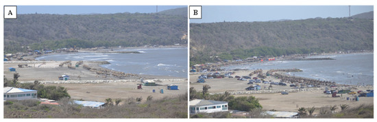 Image of Salgar Beach, Puerto Colombia. (A) 4 April 2021; (B) 23 May 2021. Note the increased number of cars and the density of beach structures in image B.