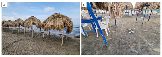 Disposable plastics were already the most found marine macro-litter on Colombian tourist beaches [10,11,35,60,61]. On Santa Marta beaches, glass items (fifth category in terms of the number of items) are also found extensively [60]. On Salgar Beach, low quantities of glass items are observed because these are not transported by the wind; thus, they remain below the kiosks/cabanas and were not identified in the images. Kiosk and cabana litter items are easily collected during cleaning the next morning.
