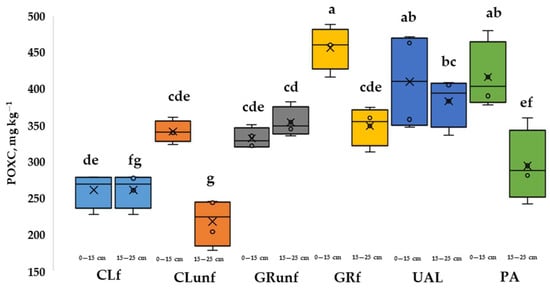The CLf land use was characterised by a similar distribution of POXC in the Ah horizon, and significant differences in the amount in the 0–15 and 15–25 cm layers were found only between the ecosystem (GRf and PA) and CLunf variants.
