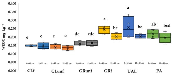 Water extractable organic carbon (WEOC) distribution according to land use and depth. Note. CLf—fertilised crop cultivation; CLunf—non–fertilised crop cultivation; GRunf—non–fertilised cut grassland cultivation; GRf—fertilised cut grassland cultivation; UAL—uncultivated abandoned land; PA—pine afforested field. Letters indicate differences (p < 0.05) between land use in the 0–15 and 15–25 cm layers. The standard errors are marked.