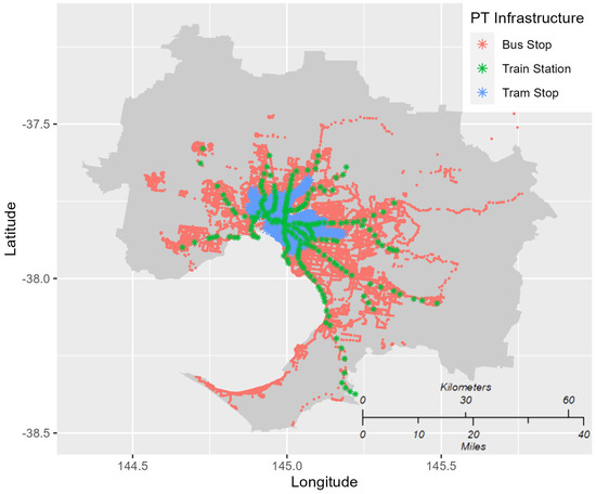 Melbourne’s PT system comprises trains, trams, and buses serving millions of commuters daily. However, despite its substantial reach, variations in usage and accessibility persist across different modes and regions. Figure 1 illustrates the distribution of PT infrastructure across the metropolitan. Our study aims to benefit urban planners, policymakers, and researchers by providing insights into the factors shaping PT usage patterns and their implications for urban mobility and social equity.