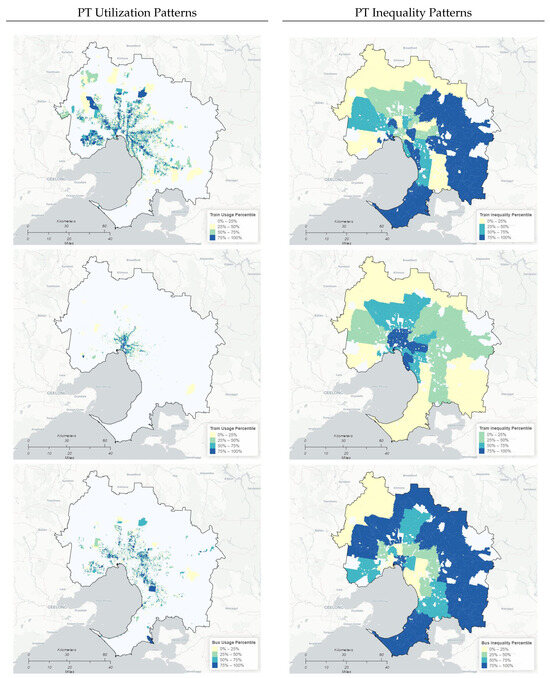 Spatial distribution of PT utilization patterns and PT inequality (90/10) patterns across Melbourne Metropolitan Area.