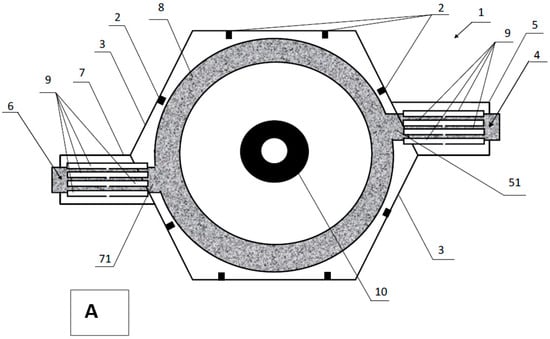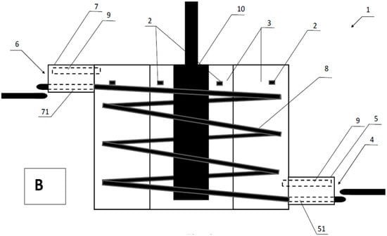 Schematic diagram of the effective technical solution apparatus allowing for the combined process of ozone treatment and UV-C irradiation of cranberries in a continuous system ((A) top view; (B) side view). Figure description: chamber (1), chamber nozzles (2), chamber walls (3), inlet (4), lower housing (5), outlet (6), upper housing (7), spiral conveyor (8), UV-C ultraviolet radiation sources (9), ventilation system (10), inlet (51) and outlet (71) fruit transportation system.