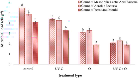 Microbiological load of cranberries on day 42 of storage. UV-C—cranberries subjected to UV-C irradiation; O—cranberries subjected to ozone treatment; UV-C + O—cranberries subjected to the combined method of UV-C irradiation and ozone treatment. Different letters indicate significant differences between experimental variants, significance level is defined as p < 0.05 (based on the Tukey test).