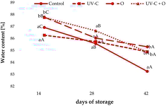 Water content in cranberries on the 42nd day of storage. Lowercase letters indicate significant differences between experimental variants on specific days of the experiment; uppercase letters indicate significant differences between the days of the experiment for the same experimental variants; significance level is defined as p < 0.05 (based on the Tukey test). UV-C—cranberries subjected to UV-C irradiation; O—cranberries subjected to ozone treatment; UV-C + O—cranberries subjected to the combined method of UV-C irradiation and ozone treatment.