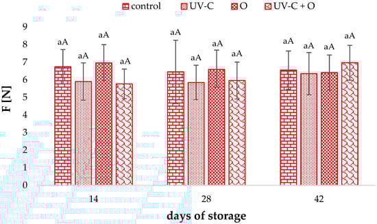 The force values required to pierce cranberries in the puncture test depending on the applied post-harvest processing technology modifications. UV-C—fruit subjected to UV-C irradiation; O—fruit subjected to ozone treatment; UV-C + O—fruit subjected to the combined method of UV-C irradiation and ozone treatment. Lowercase letters indicate significant differences between experimental variants on specific days of the experiment; uppercase letters indicate significant differences between the days of the experiment for the same experimental variants; significance level is defined as p < 0.05 (based on the Tukey test).