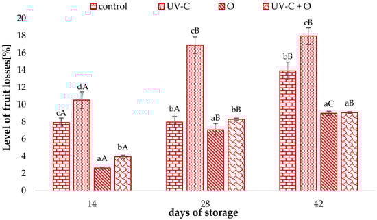 The level of fruit losses [%] in cranberries depending on the applied pre-harvest post-processing technology modification. UV-C—fruits subjected to UV-C irradiation; O—fruits subjected to ozone treatment; UV-C + O—fruits subjected to the combined method of UV-C irradiation and ozone treatment. Small letters indicate significant differences between experimental variants on individual days of the experiment; capital letters indicate significant differences between days of conducting the experiment for the same experimental variants.; significance level is defined as p < 0.05 (based on the Tukey test).