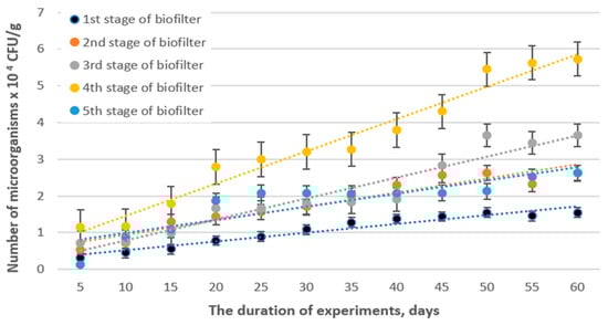 3.3. Microbiological Studies of the Packing Material and Removal Efficiency of Hydrogen Sulfide