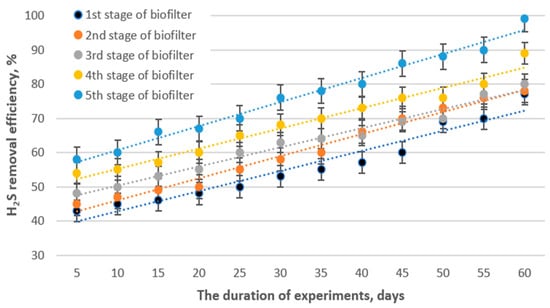 3.2. Biofiltration Performance and Kinetic Study of Hydrogen Sulfide Removal