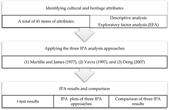 SPSS 25.0 was used for data analysis. First, a descriptive analysis was conducted to illustrate the demographic characteristics of the respondents. Second, an exploratory factor analysis (EFA) was conducted to identify the underlying factors of the cultural and heritage attributes and to test the convergent and divergent validity and internal reliability of the measurement items [91]. Third, three IPA approaches, those of Martilla and James [53], Vavra [66], and Deng [58], were used, and the results were visualized in the four quadrants. Finally, a t-test analysis was conducted to compare the results of the three IPA approaches.