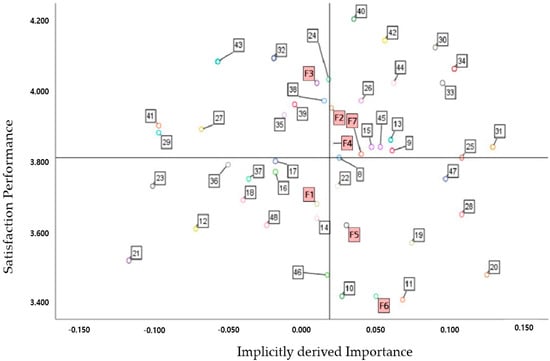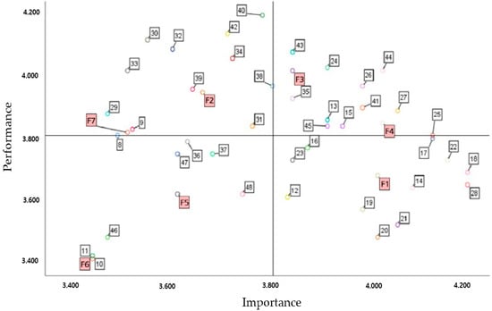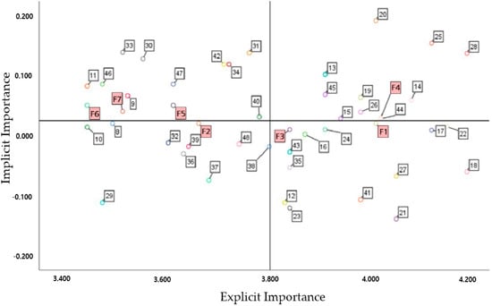 Firstly, the quadrant of the matrix presented using the IPA of Martilla and James [53] shows that 12 properties (F3, F4, 6, 8, 17, 19, 20, 28, 34, 36, 37, 38) appeared in Quadrant I, and 13 attributes (F2, F7, 2, 22, 23, 24, 25, 26, 27, 31, 32, 33, 35) appeared in Quadrant II. Ten attributes (F5, F6, 1, 3, 4, 29, 30, 39, 40, 41) were distributed in Quadrant III. Thirteen attributes (F1, 5, 7, 9, 10, 11, 12, 13, 14, 15, 16, 18, 21) were distributed in Quadrant IV.