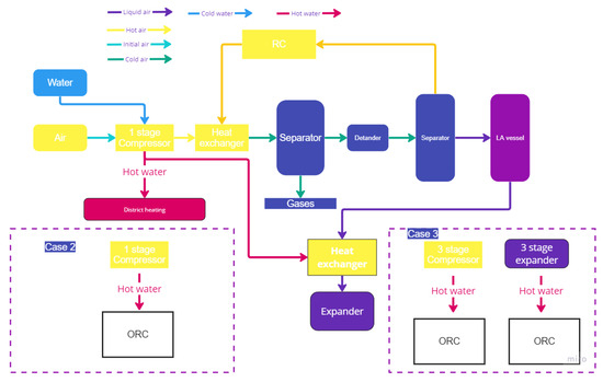 Figure 2 presents a conceptual diagram of the investigated setup and cases for study. In the thermodynamic cycle of liquid air energy storage (LAES), the working fluid is ordinary atmospheric air. Atmospheric air is drawn through an air intake device and initially passes through a mechanical filter to remove dust particles. Subsequently, the air is directed to the inlet of one or several high-pressure air compressors, where it is compressed to a pressure of 50–150 atmospheres. During the compression process, a substantial temperature increase occurs in the compressed air, reaching temperatures of several hundred degrees Celsius (400–600 °C). The high-pressure air is then cooled (to around 30–50 °C) in a heat exchanger, where heat is transferred from the high-pressure air to a cooling agent, such as water. This cooling agent is directed to a reservoir, which in the LAES technological scheme, serves as an auxiliary hot thermal reservoir.