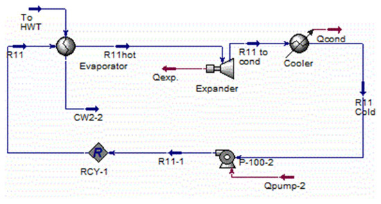 In [34], various refrigerant options for ORC systems were studied. Wang et al. analyzed the performance of nine pure organic fluids at specific operating regions and found that R11, R141b, R113, and R123 exhibited slightly better thermodynamic performances than the others [35]. The refrigerant R11 was employed as the working fluid in the organic Rankine cycle (ORC), with its technical specifications outlined in Table 2. The ORC scheme in the Aspen HYSYS software is illustrated in Figure 3. The technical parameters of the ORC cycle were adopted in accordance with [36] and are provided in Table 3.