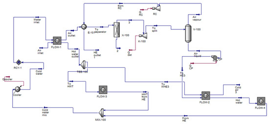 In addition, the scheme uses sub-flowsheets (Flow-1, Flow-2, Flow-3, and Flow-4). The air and recirculated water enter a three-stage compression unit, in which the air is compressed in compressors and cooled in refrigerators. The compressed air passes sequentially through the E-100 heat exchanger, where it is pre-cooled by a stream of cold air from the RC. Next, the air through the X-100 enters the K-100 expander and is cooled, and the formed two-phase flow enters the V-100. In the separator, the phases are separated, the gas phase enters the suction RC, and the compressed phase enters the CP.