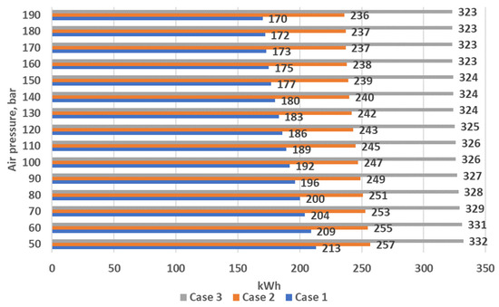 In this study, it was assumed that the liquid air energy storage (LAES) system is connected to either a thermal or electrical grid. Figure 5 illustrates the monthly variations in electricity generation from the LAES. As can be observed from the graph, the electrical energy output fluctuates significantly based on the pressure after the compressors. The disparity between the maximum and minimum investigated pressure values amounts to 9000 kWh for Case 1, 21,000 kWh for Case 2, and 43,000 kWh for Case 3. This phenomenon can be elucidated by the fact that an increase in pressure, while maintaining nearly identical temperature levels, leads to a negligible alteration in the working fluid flow rate in Case 1. Another factor is the continuous rise in the consumption of the single-stage compressor and expander. Additionally, the absence of staged cooling serves as a second reason for increased electricity generation, resulting in considerable heat consumption. It is most evident that under minimal pressure levels, electricity generation attains its maximum value due to the reduction in compressor efficiency resulting from changes in the thermophysical properties of air. The additional information on each component in the thermodynamic cycle is presented in Appendix A (Table A1, Table A2, Table A3 and Table A4). In the tables, the values entered into the diagram are highlighted in blue, and the calculated values are highlighted in black. Also, the table data show that the calculation observes the second law of thermodynamics (entropy increases at each stage). Negative enthalpy values are the result of internal HYSYS calculation procedures and do not affect the accuracy of the calculation (only the enthalpy difference matters).