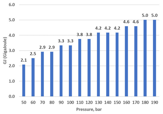 Figure 6 presents the relationship between thermal energy generation and air pressure downstream of the compressor. As illustrated in the graph, an increase in air pressure in the compressor results in increased production of thermal energy. This effect arises due to the elevation in air pressure without intermediate cooling, which leads to elevated air temperatures. Consequently, this results in greater water heating, subsequently contributing to the heating of the network water. Gcals were converted to GJ according to Formula (5). The maximum thermal energy value is attained at a pressure of 190 bar, equating to 5.0 thousand GJ per month. The minimum value occurs at 50 bar, amounting to 2.1 thousand GJ.