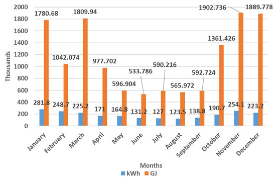 In Figure 7, the annual thermal load in Almaty, Kazakhstan is depicted. Given that Kazakhstan experiences a sharply continental climate, even the southern regions necessitate substantial heating. The thermal load in the city of Almaty typically consists of heating and hot water supply requirements. As is discernible from the graphs, the thermal load during the warm season, between April and September, is significantly lower than in the cold period due to the absence of heating demands. All city boiler houses are equipped with gas boilers. Evidently, the electrical load exhibits a similar profile. The electrical load also manifests a seasonal characteristic, diminishing during the summer months and peaking during the winter period, especially from November to January. This phenomenon can be attributed to the use of electric heaters by a portion of the city’s inhabitants and the early onset of darkness, necessitating increased illumination both outdoors and in residential and working areas.