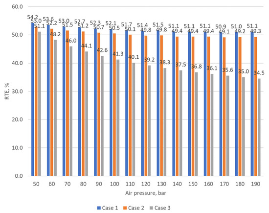Figure 8 illustrates the round-trip efficiency as a function of the pressure downstream of the air compressor. These dependencies generally align with findings reported by other researchers [10,12]. Importantly, the use of two ORC cycles allows for maximizing electrical energy acquisition, thereby enhancing overall efficiency. It is evident from the data that the highest efficiency is achieved at lower pressures, a consistent trend observed across all scenarios. This trend can be attributed to the increased specific energy consumption per kilogram of air at higher pressures and temperatures, resulting in higher energy consumption at the compressors. The maximum efficiency reaches 37.87% in Case 3, while the minimum is 15.7% in Case 1.