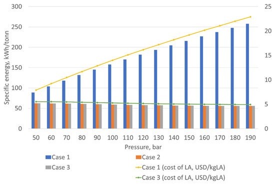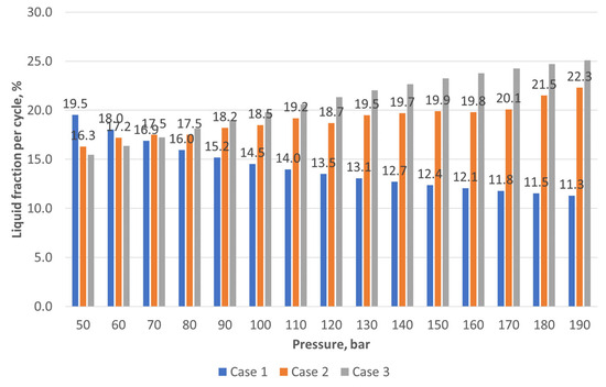 Figure 9 presents the relationship between the liquid oxygen fraction in the air and one liquefaction cycle. As evident from the graph, the utilization of multiple compression stages generally allows for a significant enhancement in performance, attributable to the overall substantial cooling and reduced work. Elevating pressure across all cycles leads to an increase in oxygen production over a single cycle.