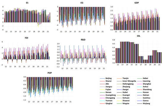 Table 3 presents the pairwise correlation coefficients of sustainability development with EG, GDP, OIL, FDI, POP, and the R_D, respectively. ES demonstrates a weak negative correlation with EG (−0.1032) and a slightly stronger negative correlation with GDP (−0.1746), indicating a tendency to decrease as economic growth and GDP increase. On the other hand, ES shows a moderate positive correlation with OIL (0.3176), suggesting a tendency to increase with higher oil production. The correlations with FDI (−0.1556), POP (−0.1367), and R_D (−0.0551) are also negative but relatively weak, indicating a slight tendency to decrease with higher levels of foreign direct investment, population, and research and development expenditures, respectively.