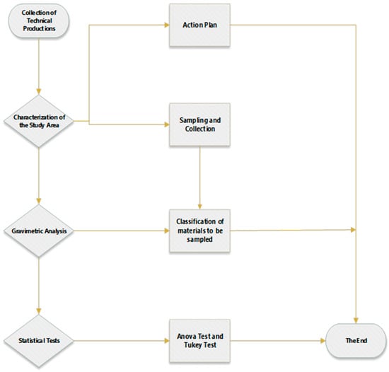 With the objective of carrying out the quantitative characterization of urban solid waste (MSW) in the twenty-one (21) neighborhoods in which the company Terraplena LTDA provides collection and transportation services, it was necessary to prepare and execute a viable and appropriate work action plan. The action plan included activities related to the on-site knowledge of the waste flow of collection routes, definition of the volume to be collected, sampling of newly deposited waste, transportation of waste to the location where the gravimetric composition was determined, that have already been described in the study of Assunção et al. []. Collections were made during the rainy season.