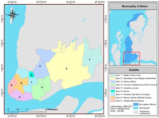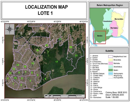 Therefore, the study area is the urban area of Belém served by Terraplena LTDA and belonging to Lot 1, according to the division presented in the Municipal Basic Sanitation Plan of Belém [], which includes 21 neighborhoods in the urban area of Belém (Figure 2), totaling 37 itineraries (routes).