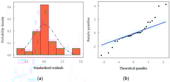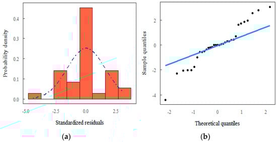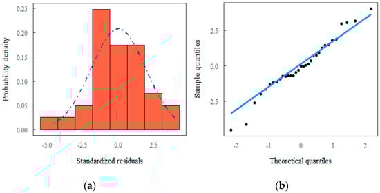 The test selected was the Shapiro–Wilk (W test), as it calculates samples: 2 < n < 50. The test result was obtained by dividing the square of the appropriate linear combination of the sample’s ordered values by the estimated symmetric variance []. The test was performed, along with a probability distribution analysis (Q-Q plot), in addition to descriptive statistics of the data set.